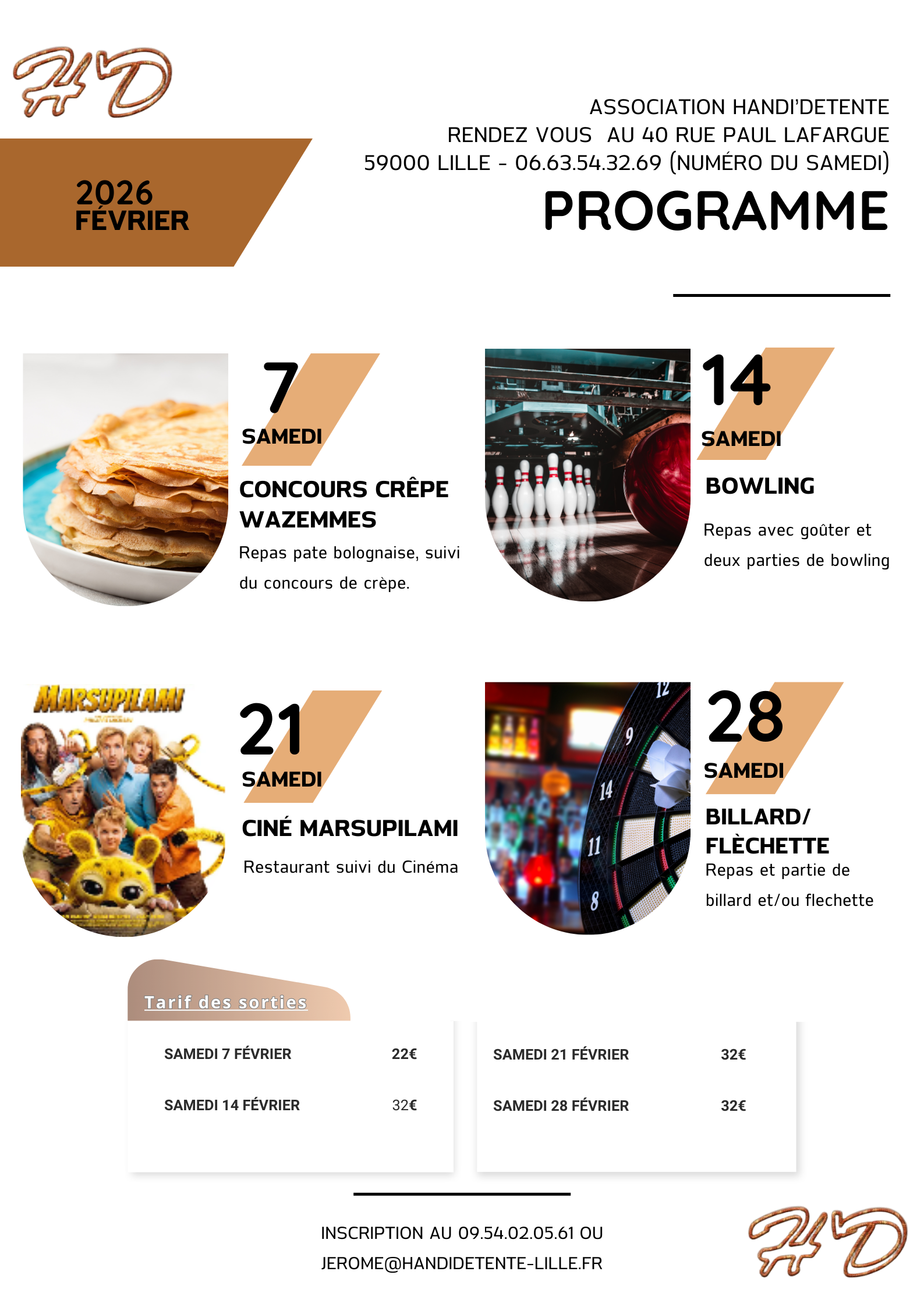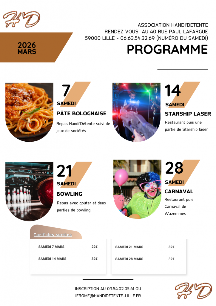 Nous proposons une adhésion de 20€ à l'année (de août à septembre) pour ceux ayant un handicap mental. Vous pouvez contacter l'association au 09.54.02.05.61 ou bien par mail jerome@handidetente-lille.fr